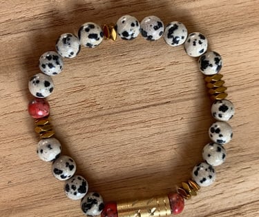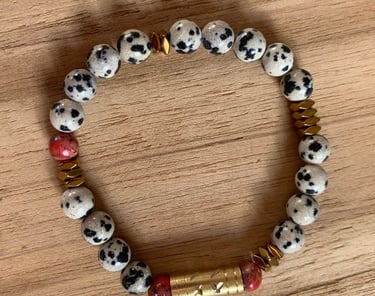 "Sens" écrit en hématite & perles de jaspe dalmatien pour apporter ancrage et stabilité.