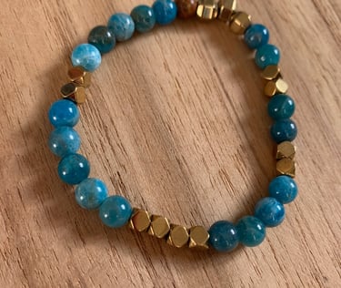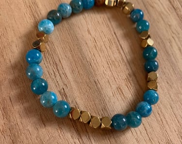 "Libre" écrit en hématite & pierres d'apatite bleue turquoise pour favoriser une expression claire.
