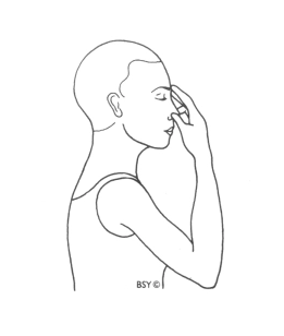 Placer l’index et le majeur de votre main droite délicatement entre les sourcils. Le pouce viendra naturellement se placer contre la narine droite. L’annulaire et l’auriculaire viendront fermer la narine gauche.